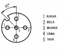 Download PDF ~ Connector 5R 12 0 10 PUR/M (HA) MOŠKI MALE Electrical scheme: Features Value Dimensions M12 Switching current I[mA] Material housing PUR Housing Dimensions L 43,9 mm Mechanical protection IP 68 Connection Temperature operating range - 25°C to + 85°C LED function NO Supply voltage 250 V Diameter 0,25 mm2 Pin 5