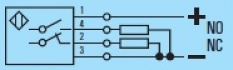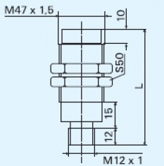 Download PDF Inductive switch ~ Connector DCA 47 5629 K PNP NO+NC Picture: Scheme: Electrical scheme: Features Value Dimensions M47 Mounting Unshielded Switching distance Sn [mm] 25 Supply voltage DC Supply voltage U[V] 10-30 V DC Voltage drop U[Ud] 1,5 V Voltage tolerance Ud < 10% Consumption Io[mA] 10 mA Max current I[mA] 250mA Material housing Aluminium Housing form Tubular Housing Dimensions L 93 mm Mechanical protection IP 67 Connection M12-4p Temperature operating range -25°C to + 70°C Repeat accuracy R < 2% Sn Hysteresis Hy 1% - 15% Switching frequency [ f ] 100 Hz Polarity protection Build in LED function Yes