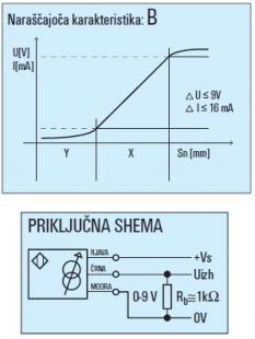 Prenesi PDF Induktivni senzor ~ Analogni DCAL12 4619 U ANALOGNA NARAŠČAJOČE 1-9V Slika: Shema: Električna shema: Lastnost Vrednost Dimenzija M 12 Način vgradnje stikala Poravnan Preklopna razdalja Sn [mm] 1 - 2 Napajalna napetost DC Napajalna napetost U[V] 15-30 V DC Valovistost napetosti Ud 0.8 Lastna raba Io[mA] >20mA Material ohišja Nerjavno jeklo 1.4301 Oblika ohišja valjasta Dimenzija ohišja (L) 55 mm Mehanska zaščita IP 67 Priklop 2m PVC Temperatura območje delovanja 0 °C do + 60 °C Temperaturno odstopanje 0.8 Zaščita zamenjave polov Vgrajena Neuporabna cona 1mm