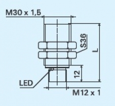 Download PDF Inductive switch ~ Short housing, connector version DSA 30 4608 K NPN NO Picture: Scheme: Electrical scheme: Features Value Dimensions M30 Mounting Shielded Switching distance Sn [mm] 10 Supply voltage DC Supply voltage U[V] 10-30 V DC Voltage drop U[Ud] 1,5 V Voltage tolerance Ud < 10% Consumption Io[mA] 10 mA Max current I[mA] 200mA Material housing Nickel plated brass Housing form Tubular Housing Dimensions L 48 mm Mechanical protection IP 67 Connection M12-4p Temperature operating range -25°C to + 70°C Repeat accuracy R < 2% Sn Hysteresis Hy 1% - 15% Switching frequency [ f ] 200 Hz LED function Yes