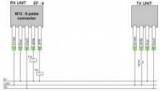 Download PDF EF-A-1100 A varnostna svetlobna zavesa Picture: Scheme: Electrical scheme: Features Value Manufacturer Response time Operating distance Supply voltage U[V] Mechanical protection Temperature operating range Connection Dodatno naročite: Za priklop: Oddajnik: 4R 12 0 02 PVC/F (X) Sprejemnik: 5R 12 0 02 PVC/F (X) Nosilec za montažo STVB Za izklop naprave: Varnostni modul REL011 ( 3xNO, 1x NC)